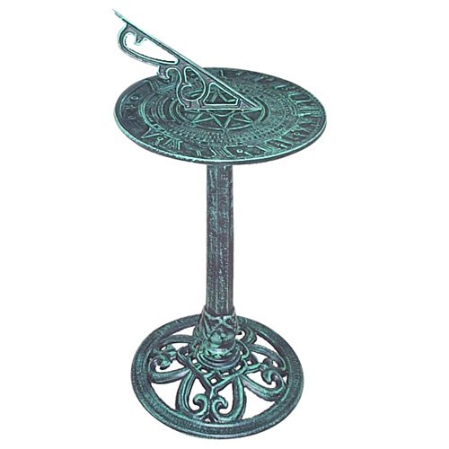Relax in your flower garden and watch the hours of the day pass with the Garden Sundial on Pedestal. With a decorative base and a beautiful Verdigris finish, this sundial is sure to stand out in your outdoor living area. Available in Verdigris finish. Made of cast iron with a cast aluminum sundial. For decorative purposes. Overall measurements 13-7/8" in diameter and 31" high.